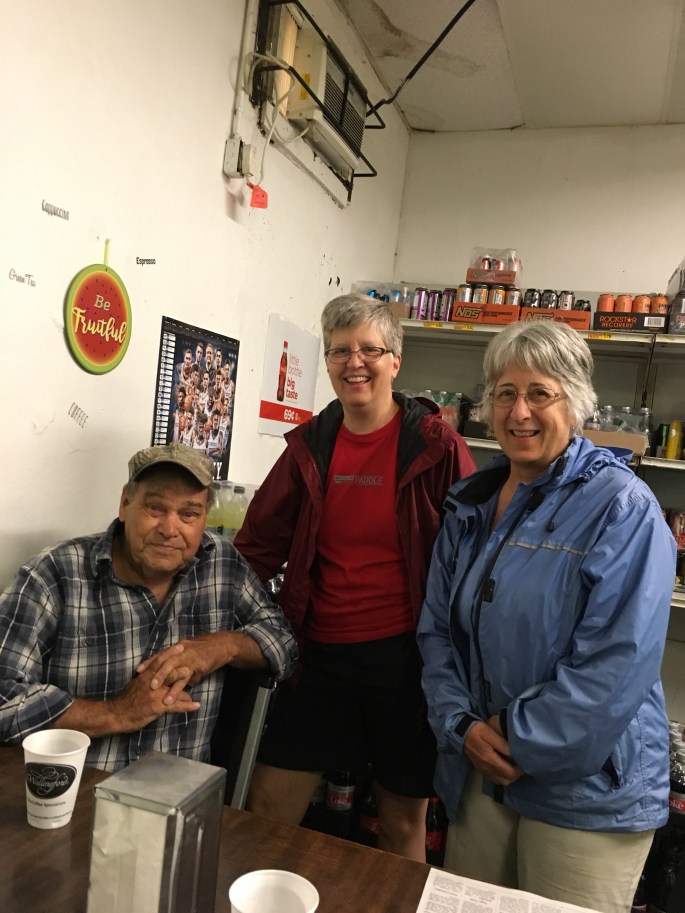 As was the case about this time last year. The rain has gotten to us and we have pulled off the river to spend a night at the Holiday Inn in Paducah, Kentucky. They have washers and dryers and restaurants and other amenities we don’t get on the river. We stopped at the little grocery store where we were camping and they connected us with someone who would drive us the 25 minute distance. All things work out well. The driver needed some gas and we needed a ride! They let us check in early so we have both had warm showers and dry clothes and we will soon head out to visit the quilting museum here in Paducah and other sites as the weather may allow. Here are some pictures from the last few hours including the guys who hang out at the grocery, one of whom spend 40 years on the rover boats, our ride, and our wet, soggy selves at the hotel.