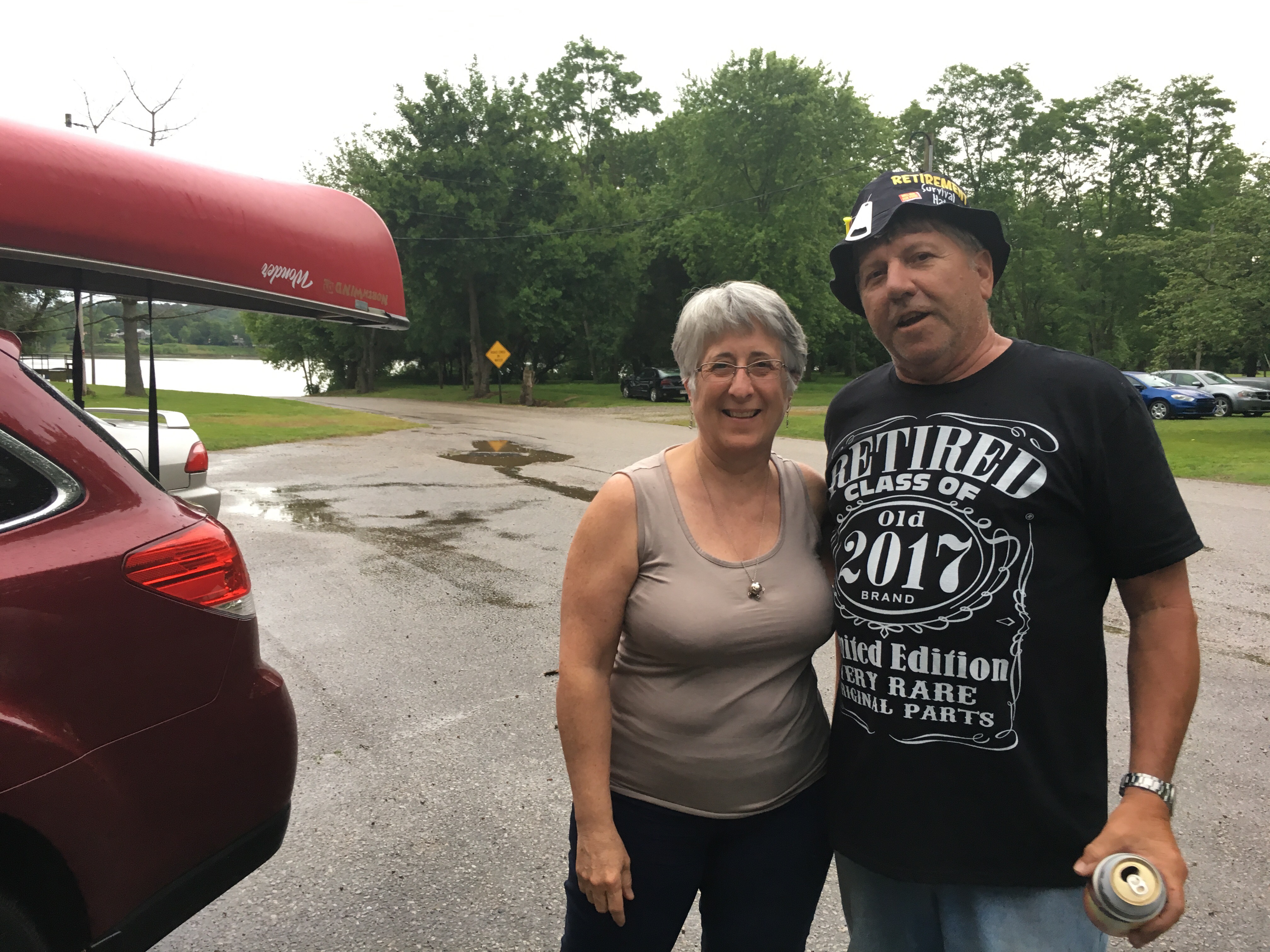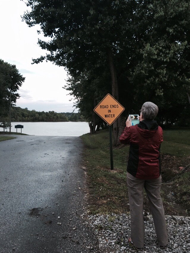 The day has gone very smoothly. Karen’s drive to Cincinnati and my flight to Cincinnati were easy and we happily met at the airport. From there we had another three hours or so to get to Rome Indiana where we got out of the river last year. We stopped across the river from Louisville in New Albany and found a burger place for dinner. The rest of the drive brought a heavy downpour that had mostly stopped by the time we pulled into the park in Rome. We had gotten previous permission to camp here but were uncharacteristically daunted by the large family party going on with music, beer, horseshoes, etc. We felt like we were crashing a party that might go on all night and weren’t sure how to proceed. Our hesitation was quickly overcome by the approach of the guest of honor from the party. Noah was being feted for his retirement from coal mining. And he quickly said: “I know who you are! You are those ladies paddling down the river.” We were fast friends. Before long we were offered a covered shelter with electricity and met Hawk and Tim as well. All we can say is that we continue to stand in awe of the grace and hospitality we receive along the way. For those who worry about us….this hospitality is what we live for and what keeps us going. We are tucked in now for the night, hiding out from the skeeters. Tomorrow we head downriver.