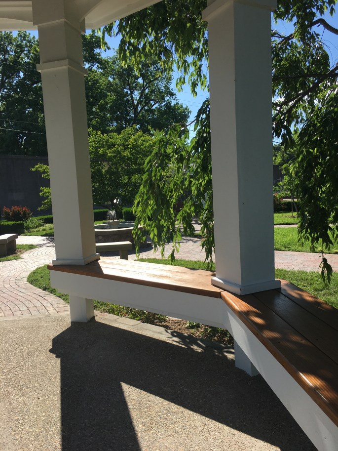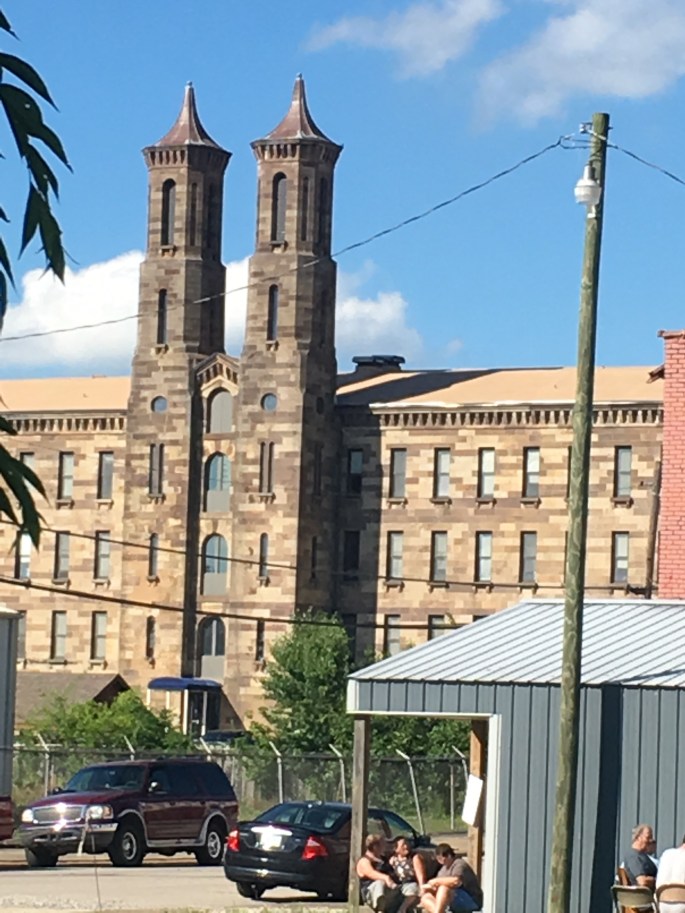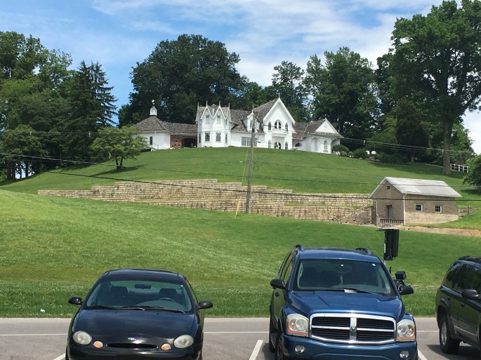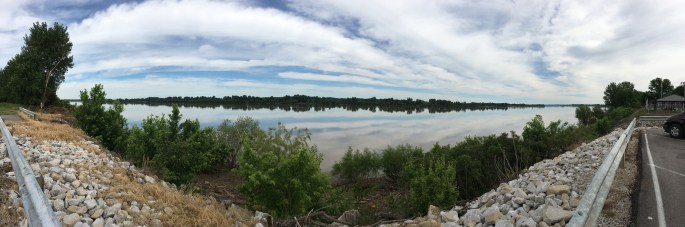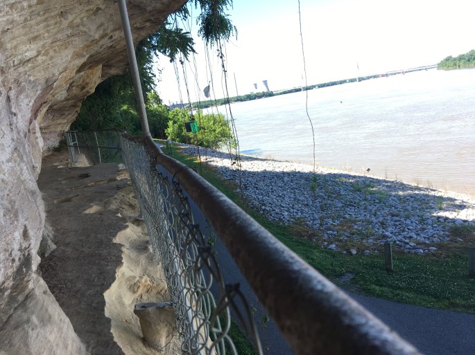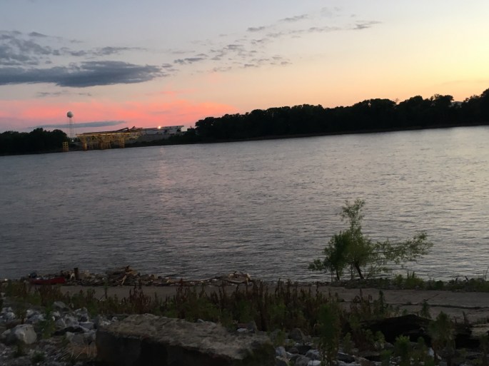 Last year we took a break from the river in the middle of the week because it was really hot. This year we found ourselves taking a break in the middle of the week because it is cold and rainy. We were not expecting the cold part of that. So last night we paddled into a marina in Evansville, Indiana, and we were able to pull our canoe up onto their docs under cover. They allowed us to use their bathrooms including a shower which was a wonderful gift. And then we set up our tent up on the grassy knoll behind the metal shipping container. About 4 AM this morning the rain started and it’s now 8:30 PM and it is still raining. We were surprised early this morning to find a friend of a friend in the driveway of the marina. He offered to take us into Evansville and treat us to breakfast. We ate at Penny Lane Café and then Gary drove us to the visitor center which is in they called building shaped like a pagoda. We went up on the roof and looked at wet views of the Ohio River. And we met another couple from Texas and visited with them for a while. Gary then took over to the Evansville others stadium which is also the stadium that was used for filming A League of Their Own. By the time we had driven around Evansville and made the stops it was time for lunch so we went to a local German restaurant. Gary returned us to a campsite and we spent the next couple of hours learning about and touring the LST 135 which is permanently docked Right next to where we were camping. We learned about this interesting World War II vessel and the history of Evansville in the making of hundreds of LSTs.