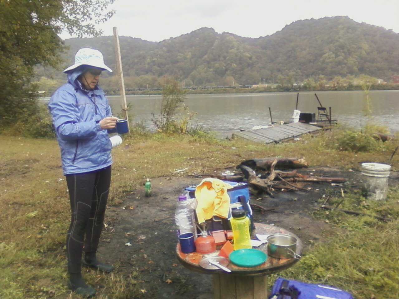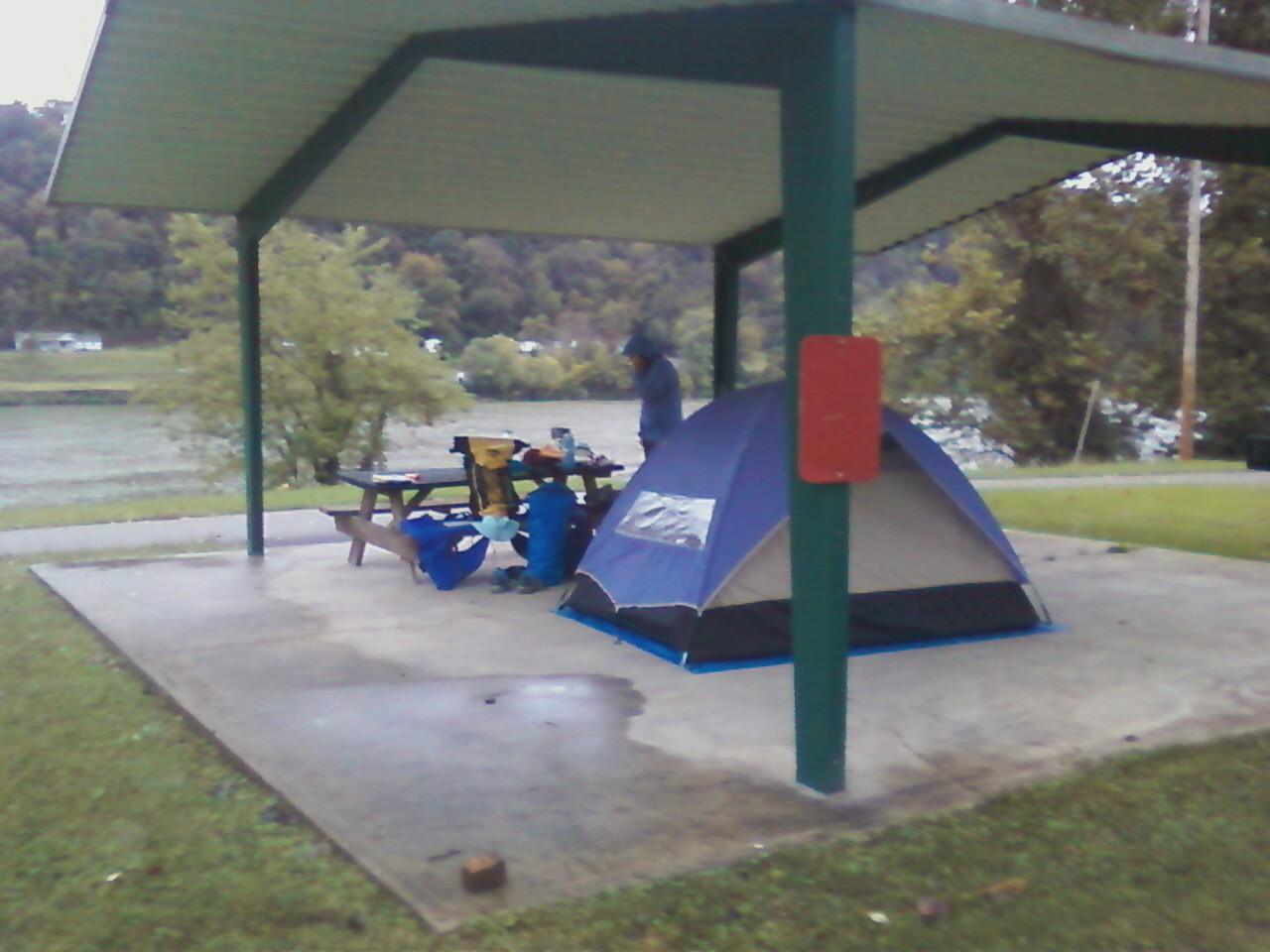 We spent three rainy days on the Ohio River this time…we almost pulled the plug on the adventure this time after the first day. We were soaked, shivering and the end of the rain was not in sight. However, we found a park shelter and hunkered down after finding a sports bar in Paden City, WV, to get a hot supper. In the morning (and we did stay dry and warm in the tent!) we decided to chance another day…heading out to the amazement of some of the people in the RV park who stood and took our photos as we set sail. We paddled for about 30 minutes when the rains started again and we found another shelter and stayed for about two hours, fixing our first hot lunch and finding a heated restroom at the campground where we warmed up a bit. We decided to shoot for a Wayne National Forest and a campground about 17 miles down. As long as we knew we had a campground ahead, we didn’t mind the idea of getting soaked again…so we did and we were rewarded by finding a peaceful lagoon like entrance to the park…quiet and still. We set up camp, enjoyed the bath facilities including how showers and successfully made a smoky campfire with soaked wood…but it was a campfire. A beautiful park and refuge for us. Finally, the third day we awoke to the potential of no rain. We headed out with Marietta in our scopes. We paddled the full day, only a mist of rain but cloudy…sometimes the clouds thinned enough that we got a bit of sunburn on our noses. When we got out in Marietta, Ohio, a quaint small city on the river, the sun came out in earnest to celebrate our completing 400 miles of our journey since 2001! So, it was worth it to us…the river continues to entrance me and gave us gifts like the siting of a bald eagle on that last day! More later…from both of us!
