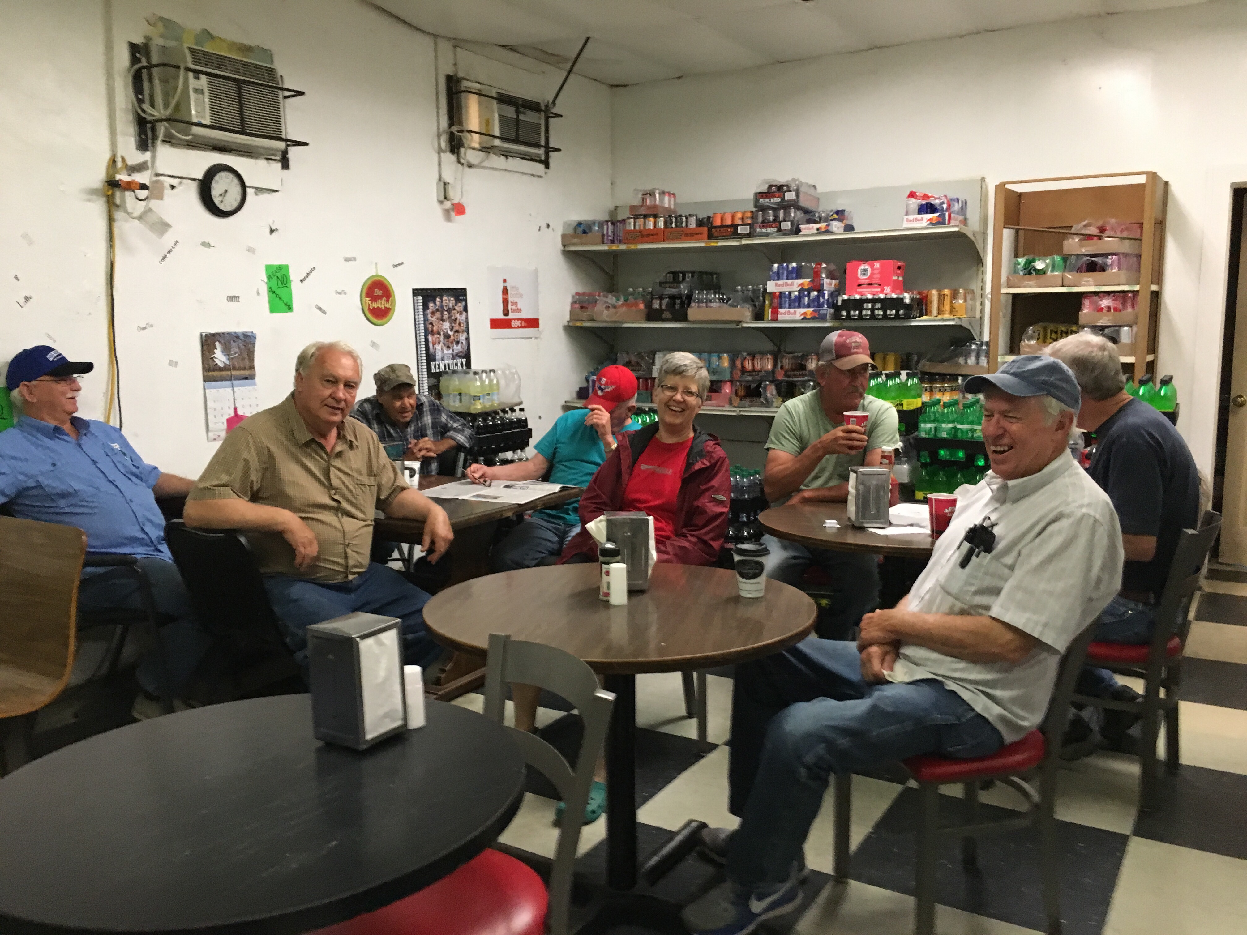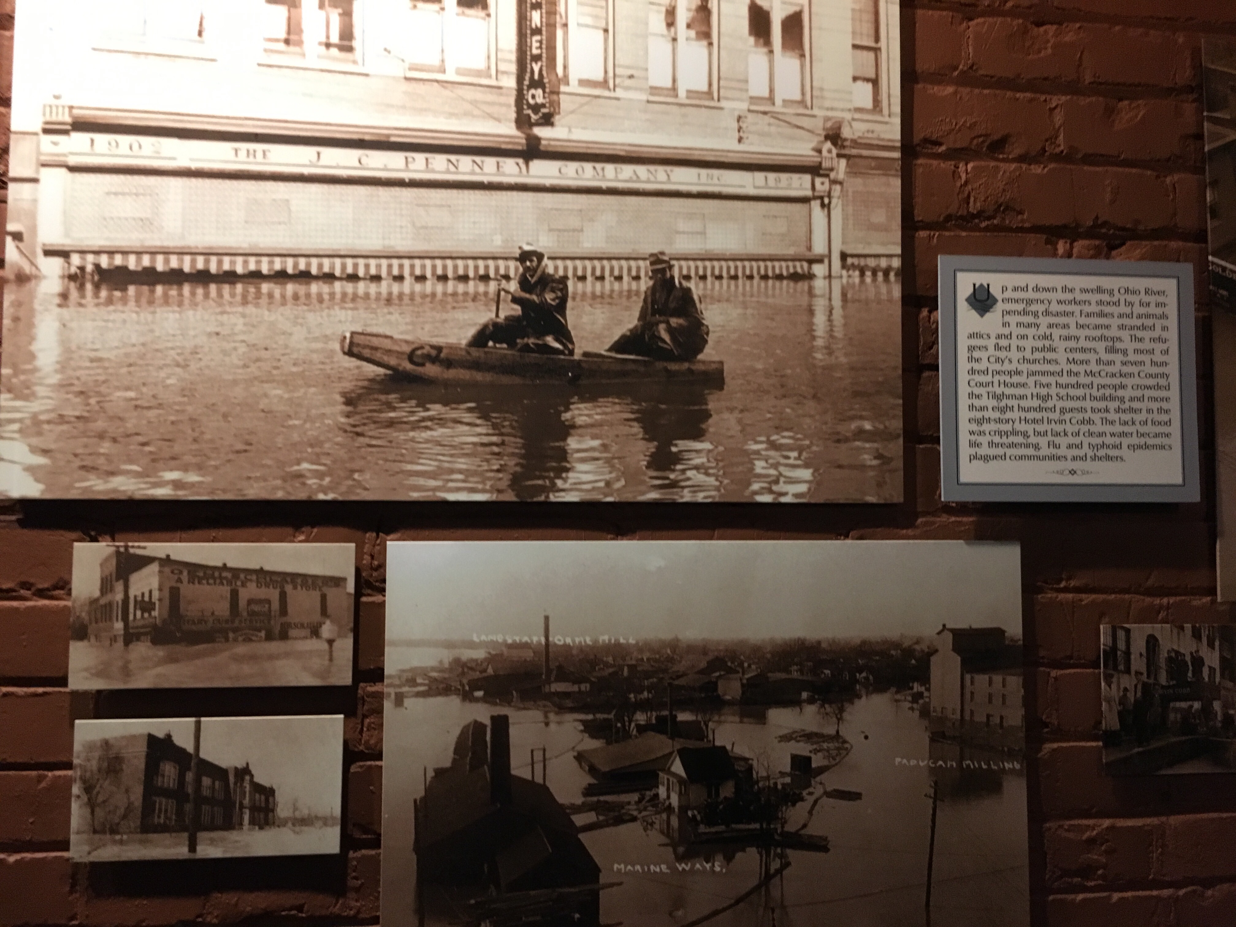 As was the case about this time last year. The rain has gotten to us and we have pulled off the river to spend a night at the Holiday Inn in Paducah, Kentucky. They have washers and dryers and restaurants and other amenities we don’t get on the river. We stopped at the little grocery store where we were camping and they connected us with someone who would drive us the 25 minute distance. All things work out well. The driver needed some gas and we needed a ride! They let us check in early so we have both had warm showers and dry clothes and we will soon head out to visit the quilting museum here in Paducah and other sites as the weather may allow. Here are some pictures from the last few hours including the guys who hang out at the grocery, one of whom spend 40 years on the rover boats, our ride, and our wet, soggy selves at the hotel.