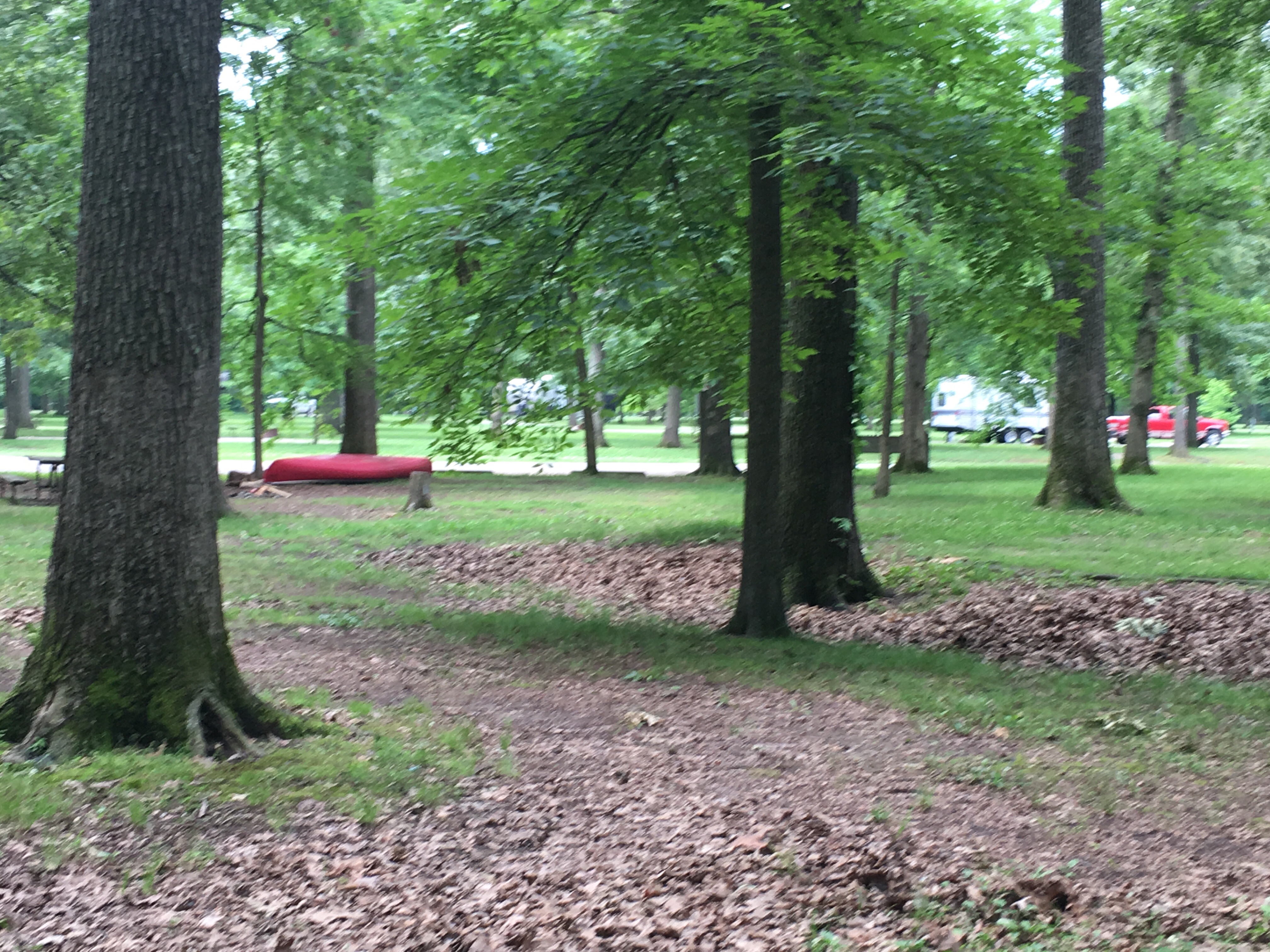 We are anticipating rain a lot of the day and pretty strong winds. However the winds never got unbearable and we were able to find shelter in some channels along the islands. One thing we are noticing as we get to the lower part of the Ohio River is that there are a lot of bars and a lot more islands undoubtedly do to the build up of silt along the way. We had to maneuver around more towboats and barges when we got to Paducah where the Tennessee River empties into the Ohio River. That provided a challenge for us but it worked out and we proceeded down the river and managed to find this beautiful state park before the afternoon rains hit. The visitor center was closed but we saw a man on a tractor and went to talk to him. Turns out he is a Ranger and he agreed to meet us with his truck and go pick up the canoe and all of our gear and bring it to a campsite. We just got the campsite set u we are sitting under a park shelter as the thunder and rain whirl around us. As soon as the rain stops for what looks like about an hour, we’re going to walk into Metropolis, Illinois, and see if we can find the Superman Museum.