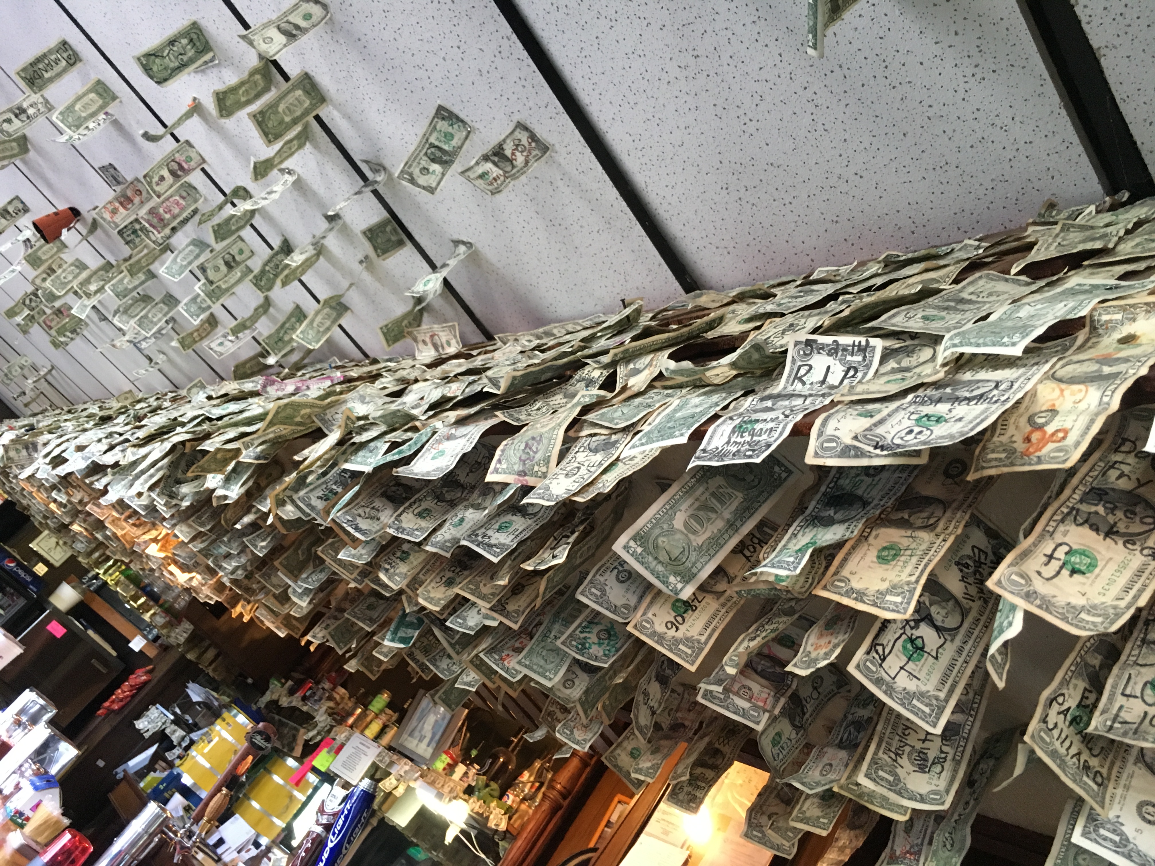 Karen and Gary took us up on our invite to join us for dinner and they suggested the little restaurant (see photo of dollar bills hanging over the bar) by the ramp where we enjoyed a local experience with corn meal dipped white fish, corn nuggets and potato munchers! An animated waitress and the folks coming in to play cards added to the experience. And The Andy Griffith Show was playing in the background.