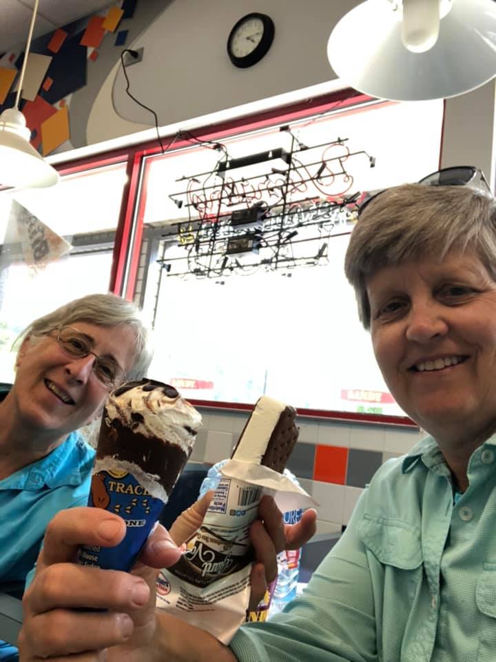 June 18: We had a leisurely paddle to our destination at Shilkellamy State Park in Sunbury, PA. It was a beautiful day. Our paddling included the required Snickers break and some shore time looking for heart stones to bring home to John. We also saw some interesting red shale or slate cliff faces along the river. We arrived at the park at 2:45 pm where Maggie’s sister, Christy Smith was waiting for us. Our directions to her had not been clear and it took a few phone calls to find that she was indeed at the right place. We are learning the canoes are not as common as kayaks and so when you say to find the canoe rental shop when they actually rent kayaks…well the folks in the neighborhood just didn’t seem to understand the difference. But there she was waving us in. Maggie’s car was where we had left it and we packed up and headed to a motel followed by Skeeter’s BBQ overlooking the river. It is always fun to have some leisure time looking out over the river we have paddled. Ice cream was searched for and found. Then to the park on the other side of the dam where we might put in next year and back to the motel for sorting of gear and debriefing, etc.
